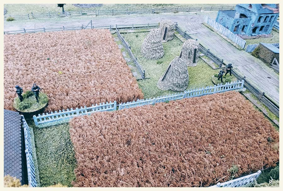 Ambush at the corner of the adjacent field hiding in the wheat. They took withering close range fire and were immediately supressed. The only thing that saved the platoon from further damage was an accurate artillery barrage that drove back both of the German platoons.